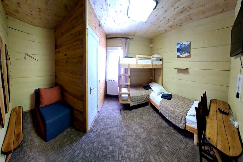 Чотиримісний сімейний номер з балконом (однокімнатний, 4-місний номер, загальна площа: 28 м. кв.) - двоспальне ліжко + 1 розкладне двоспалье ліжко або 2 односпальні ліжка + 1 розкладне двоспальне ліжко, супутникове ТБ, Wi Fi, панорамний балкон, санвузол (душова кабіна, унітаз, умивальник, кількість рушників – 2 на особу).