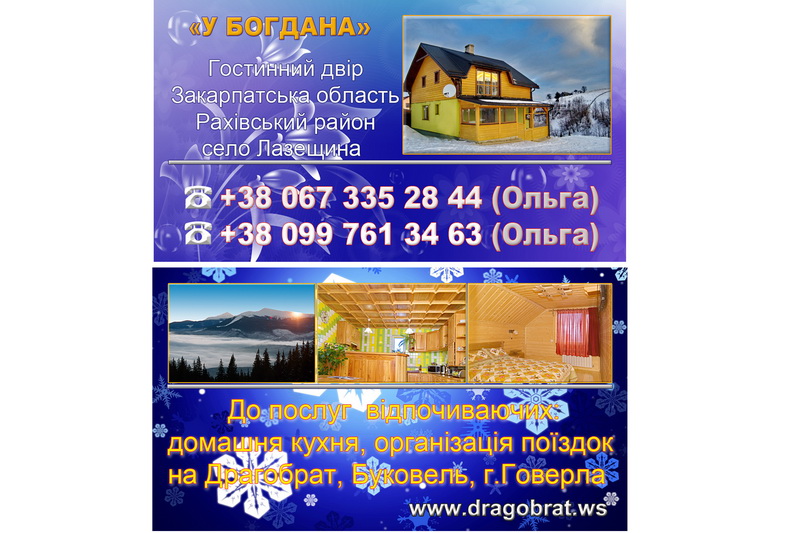 Гостинний двір "У БОГДАНА" знаходиться в селі Лазещина у підніжжі гір Говерла та Петрос, в 10км. від курорта Драгобрат та 10км. ТК Буковель. .